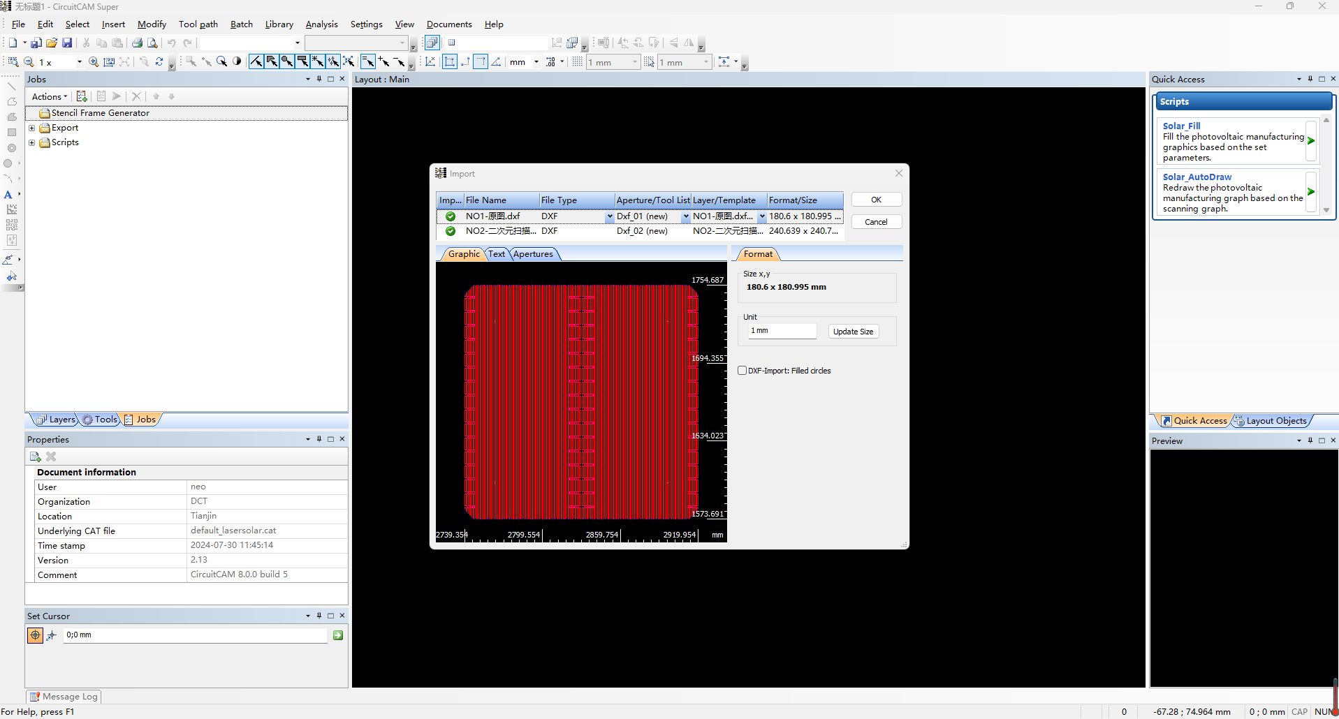 針對光伏行業(yè)的圖形處理需求,CircuitCAM8推出了LaserSolar模塊。這個模塊中,針對特定圖形的快速填充和計算、快速自動制圖等需求,推出了快速完成光伏圖形的填充計算的Solar_Fill功能;推出了以二次元掃描圖形為基準(zhǔn),一鍵自動繪制光伏圖形的Solar_AutoDraw功能。